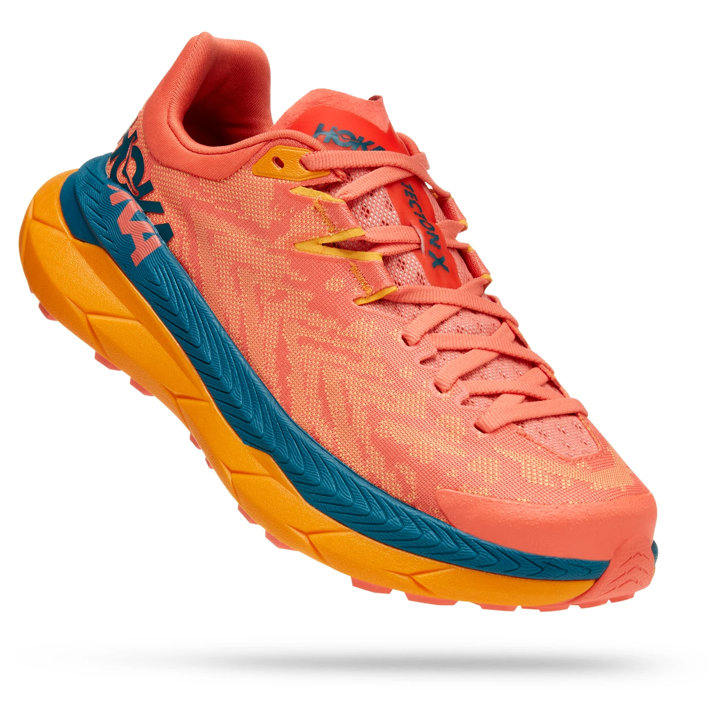 Pour la semelle extérieure, le fabricant mise sur une construction Vibram Megagrip avec Litebase. Le crantage est très mordant et accroche de manière optimale dans des conditions humides et sèches sur le sentier. Quand vous courez avec les Women’s Tecton X de Hoka, le tissu respirant en mesh jacquard évacue l’humidité vers l’extérieur.